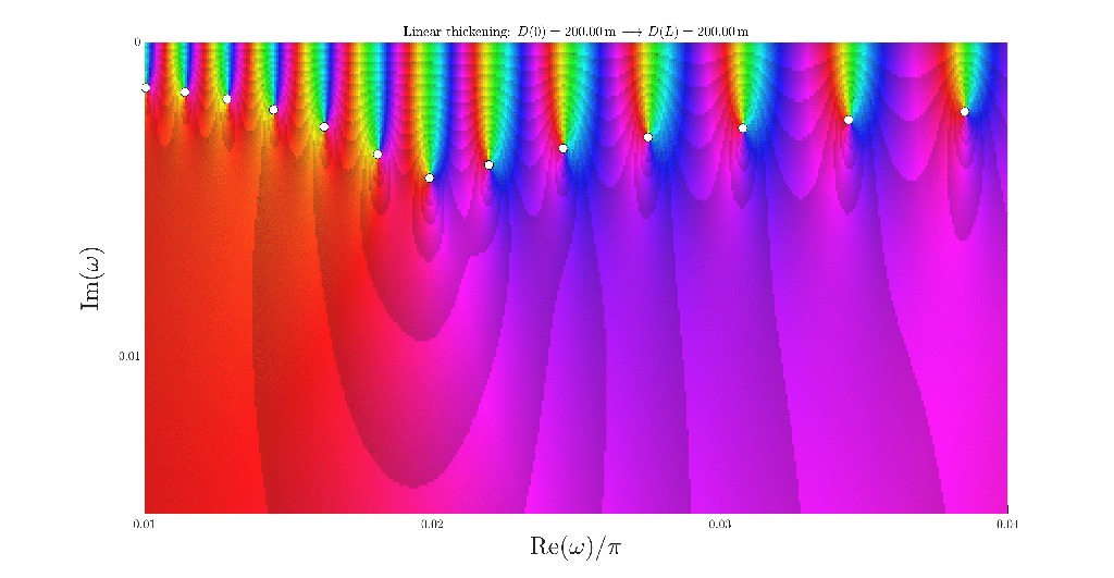 Change in complex-resonant frequencies (white bullets) caused by increasing ice-shelf thickening. Background is a representation of complex-valued reflection coefficient in complex frequency space (Bennetts & Meylan, SIAM J Appl Math, 2021).